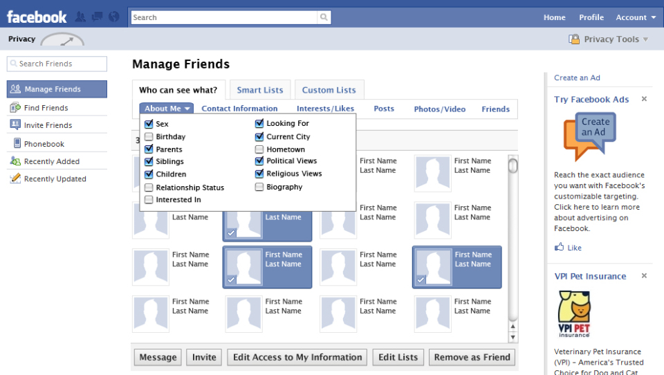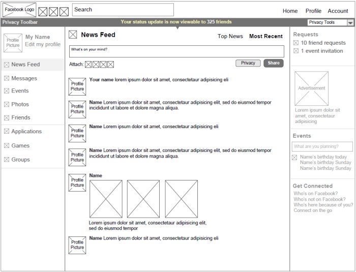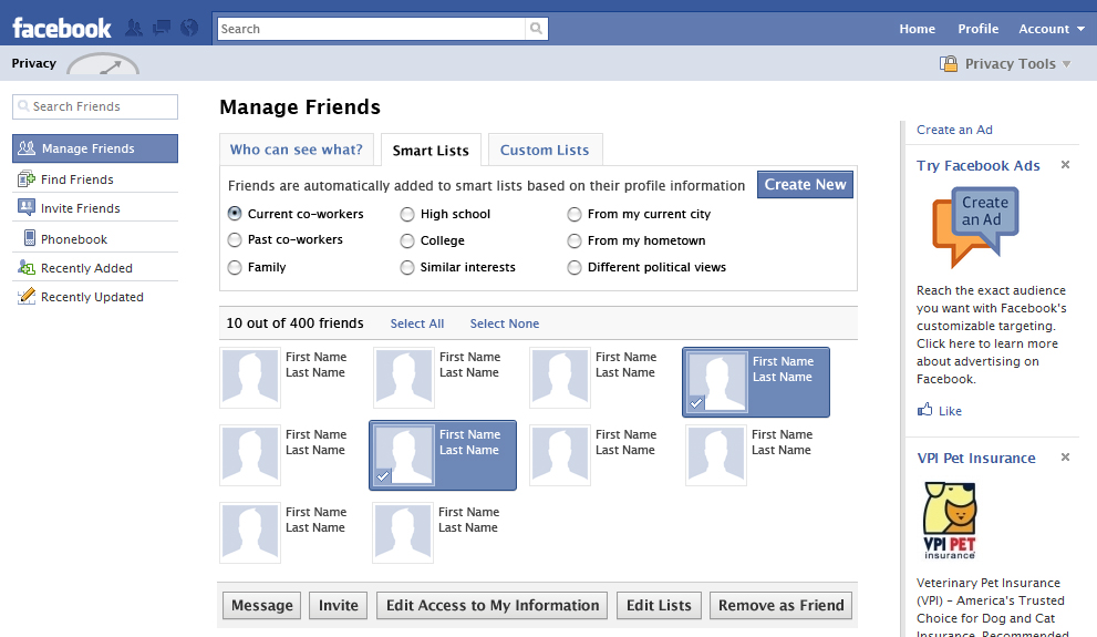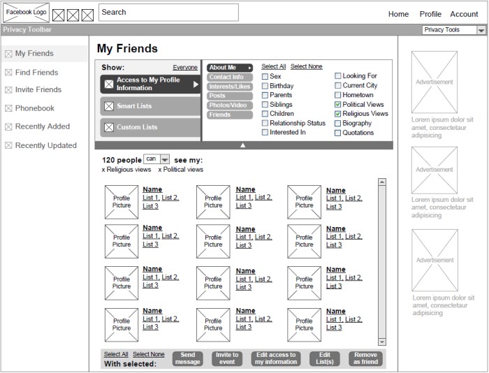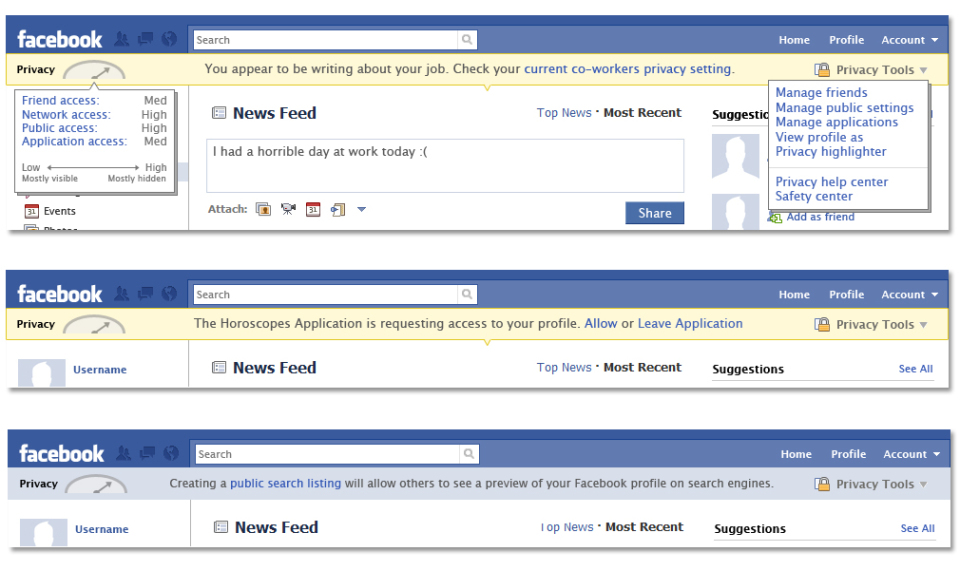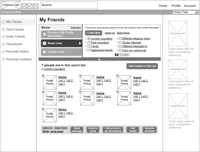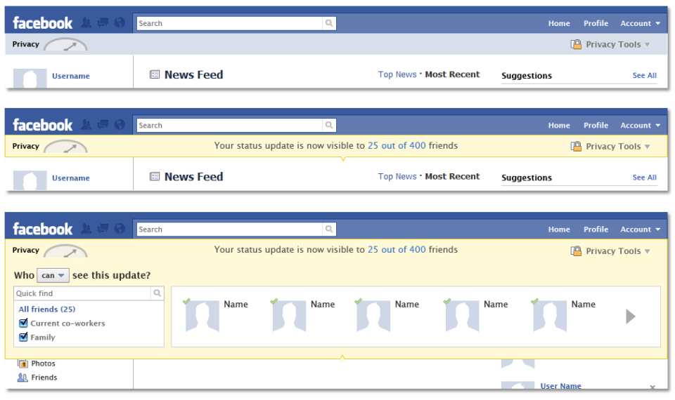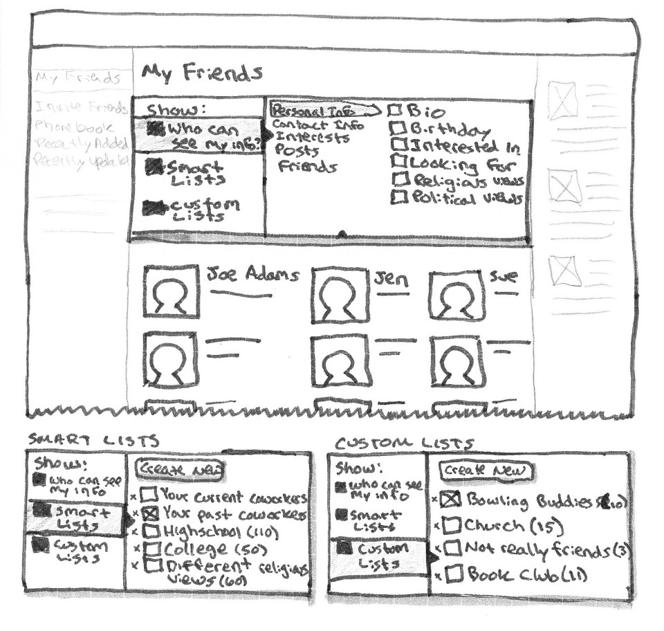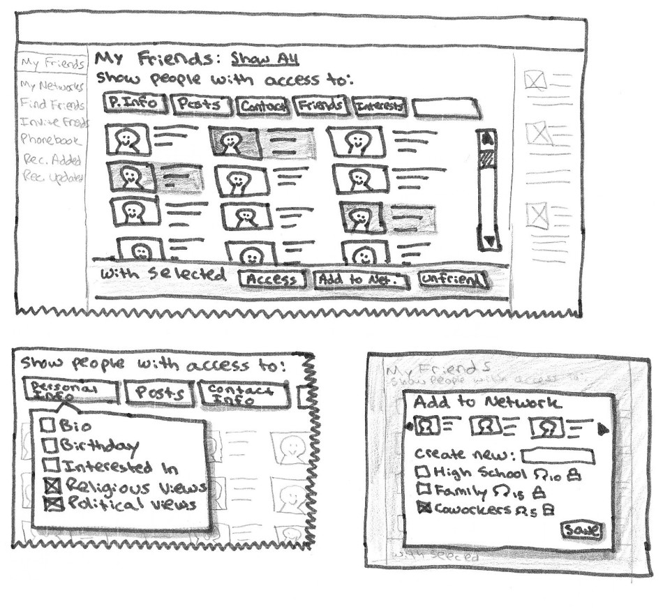 My research exposed that privacy on Facebook needs to be treated as a system of multiple interconnected pieces.  Focusing only on redesigning the privacy settings page would not solve some of the core issues that people have understanding and managing their privacy. I identified the two primary privacy problems facing Facebook today as the unwanted public disclosure of information and the difficult management of social networks. My solutions aimed to: